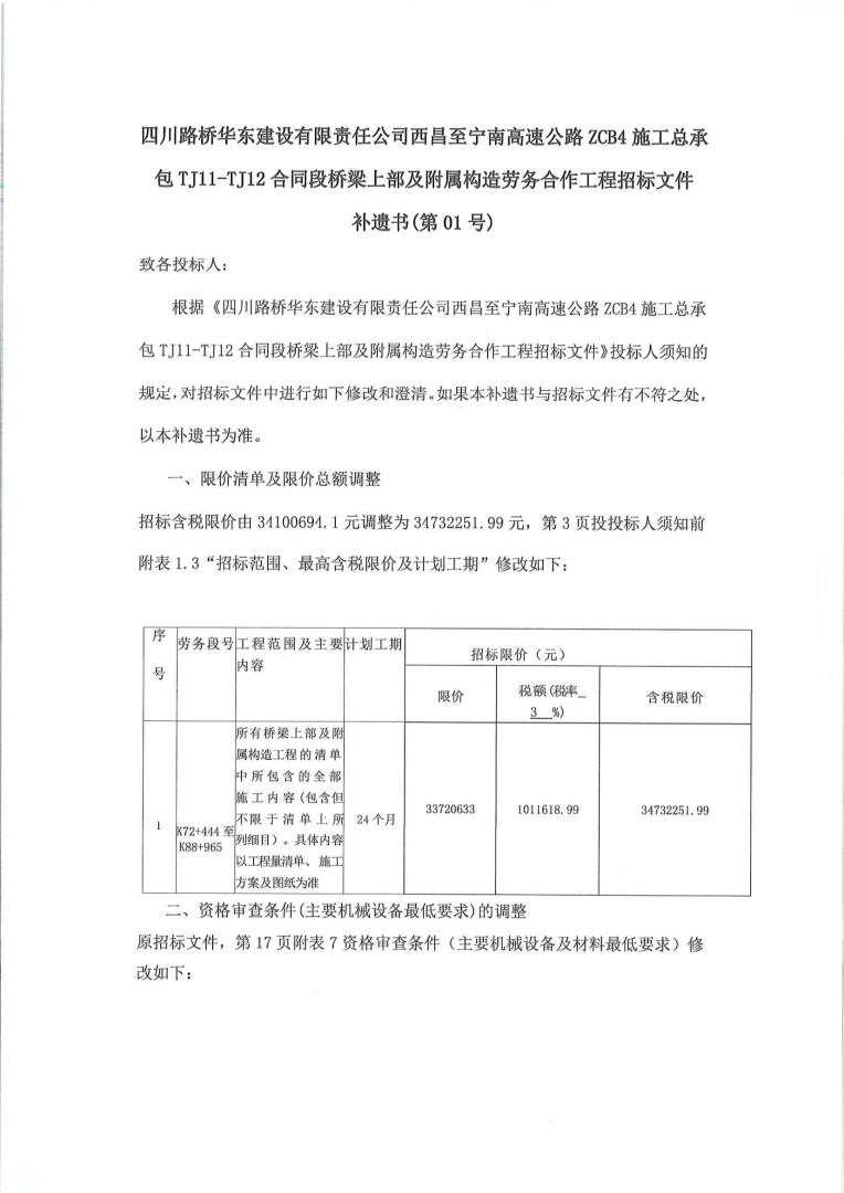 西昌至宁南高速公路ZCB4施工总承包TJ11-TJ12条约段桥梁上部及隶属结构劳务相助工程招标文件补遗书(第01号)